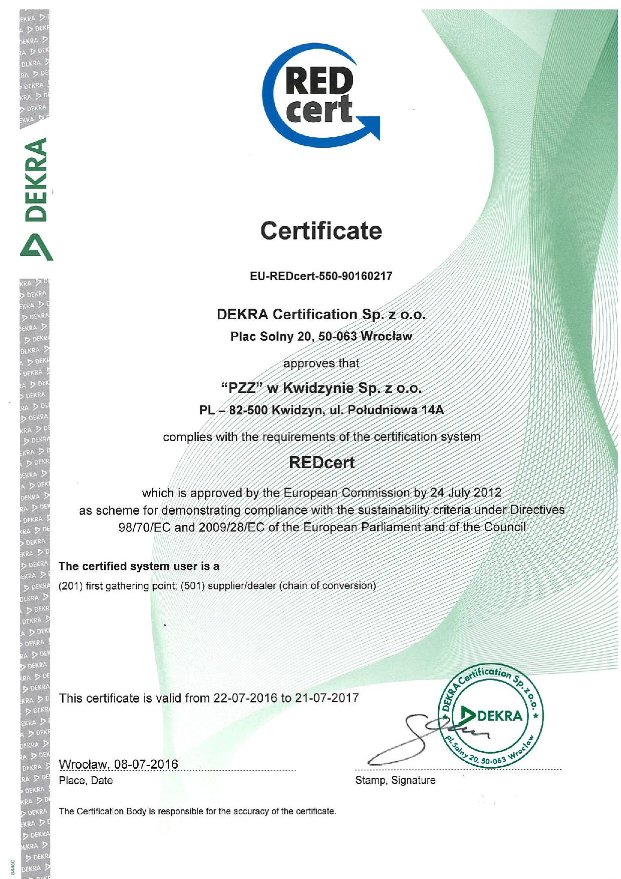Dodano: 11-08-2016 Z przyjemnością informujemy, że nasza firma po raz kolejny z sukcesem przeszła certyfikację w systemie REDcert, mającą na celu potwierdzenie osiągnięcia całkowitej zgodności z wymogami Dyrektywy Unii Europejskiej 2009/28/EC.